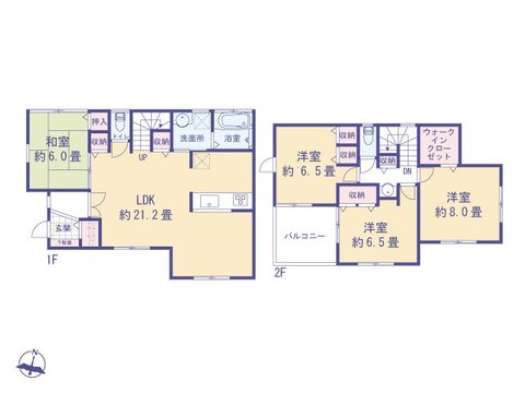 都市ガス/東京電力/公営水道/下水排水/インターホンTV/システムキッチン/バルコニー/対面キッチン/追焚給湯/温水洗浄便座/床下収納/ウォークインクローゼット/駐車場2台/トイレ2ヶ所/コンロ3口/グリル/リビング階段/LDK20畳以上/全居室6畳以上/和室/全室2面採光/全居室収納