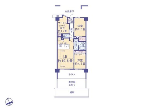 東京電力/公営水道/下水排水/収納/システムキッチン/対面キッチン/専用庭/クローゼット/ウォークインクローゼット/階下に住戸なし/南西向き/全居室収納
